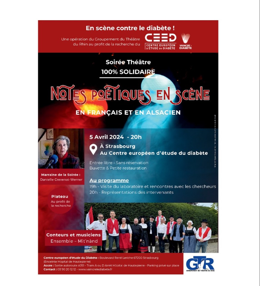 Le Groupement de Théâtre du Rhin (GTR) se mobilise à nouveau en faveur de la lutte contre le diabète en organisant une soirée spectacle au sein de l’amphithéâtre du Centre européen d’étude du Diabète (CeeD)